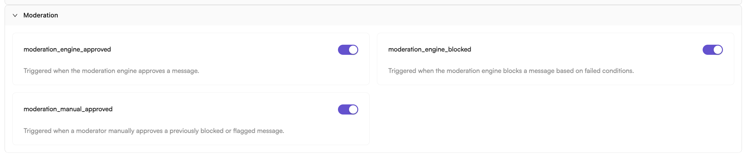 Ensure your webhook endpoint is ready to process moderation events. Refer to the Moderation Events section for the full list. The key events to handle include:moderation_engine_approved— Triggered when the engine automatically approves content.moderation_engine_blocked— Triggered when the engine automatically blocks content.moderation_manual_approved— Triggered when a moderator manually approves previously blocked content.
