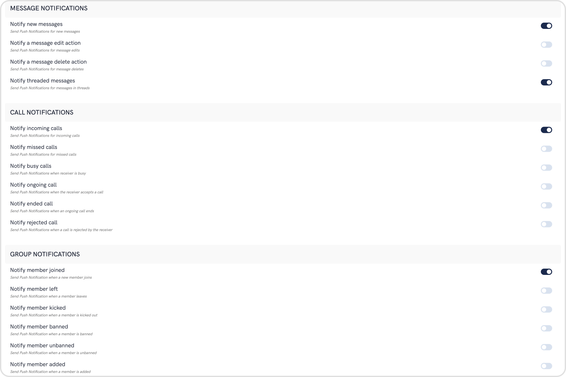 The maximum payload size supported by FCM and APNs for push notifications is approximately 4 KB. Due to the inclusion of CometChat’s message object, the payload size may exceed this limit, potentially leading to non-delivery of push notifications for certain messages. The options provided allow you to remove the sender’s metadata, receiver’s metadata, message metadata and trim the content of the text field.