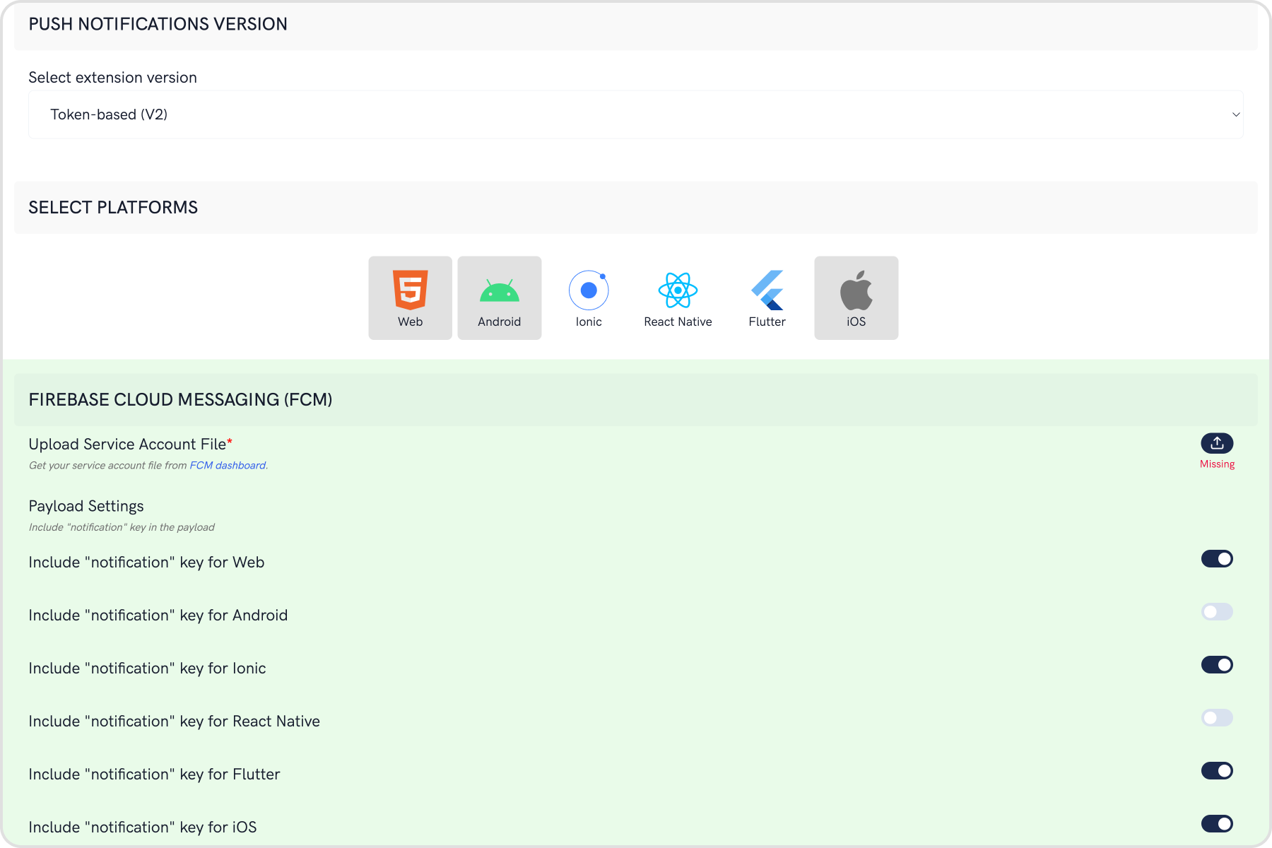 • If you are setting it for the first time, Select V2 to start using the token-based version of the Push Notification extension.