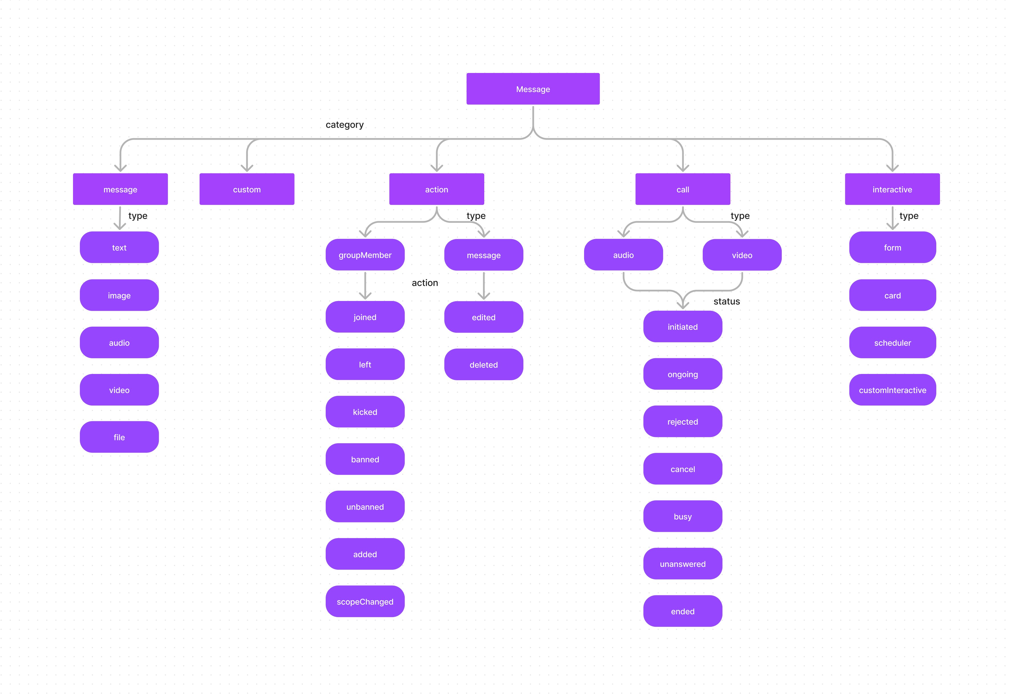 In the case of messages that belong to thecustom category, there are no predefined types. Custom messages can be used by developers to send messages that do not fit in the default category and types provided by CometChat. For messages with the category custom, the developers can set their own type to uniquely identify the custom message. A very good example of a custom message would be the sharing of location co-ordinates. In this case, the developer can decide to use the custom message with type set to location.