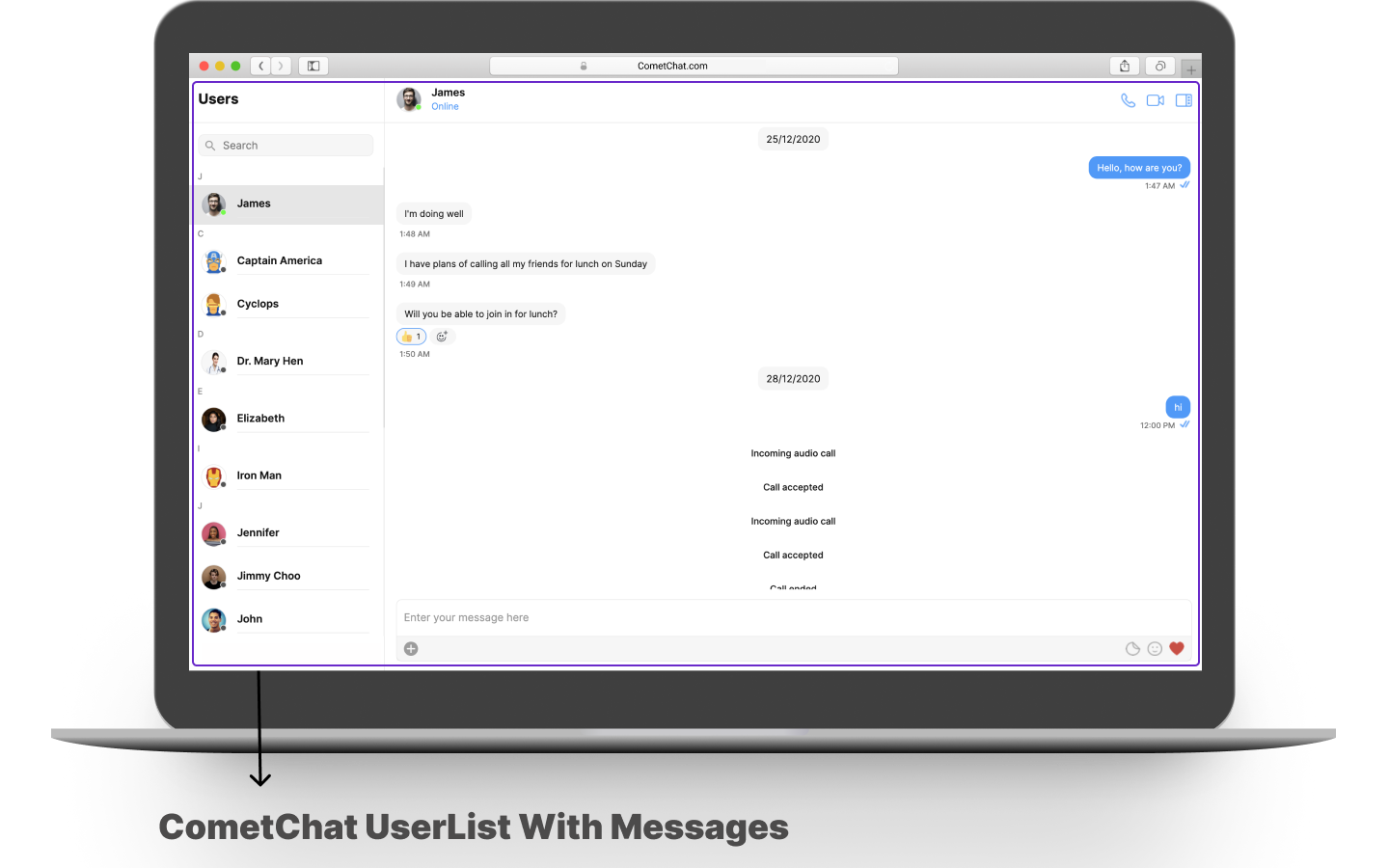 The CometChatUserListWithMessages is a component with a list of users. The component has all the necessary listeners and methods required to display the user’s list and shows the set of the messages/chats of the selected user