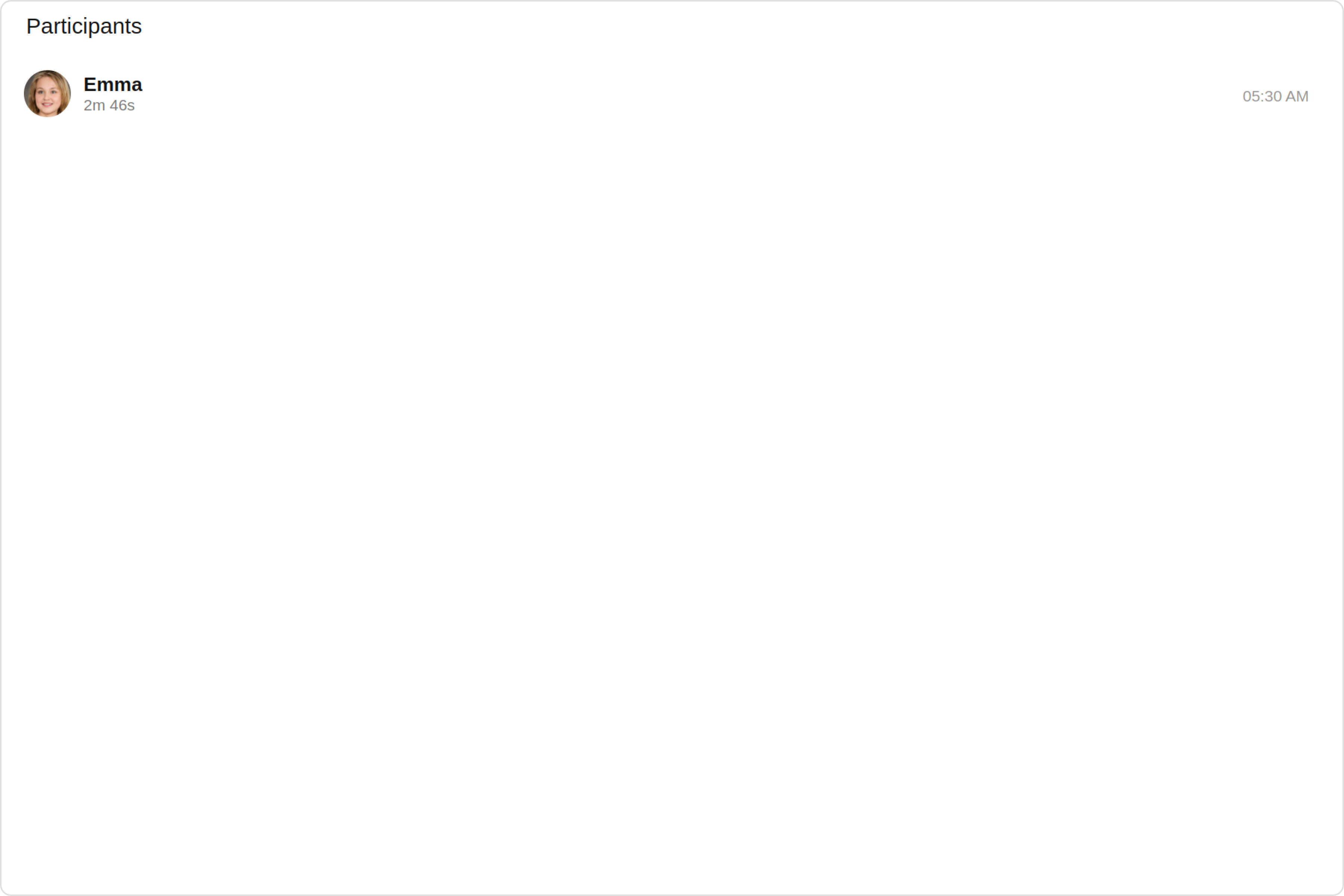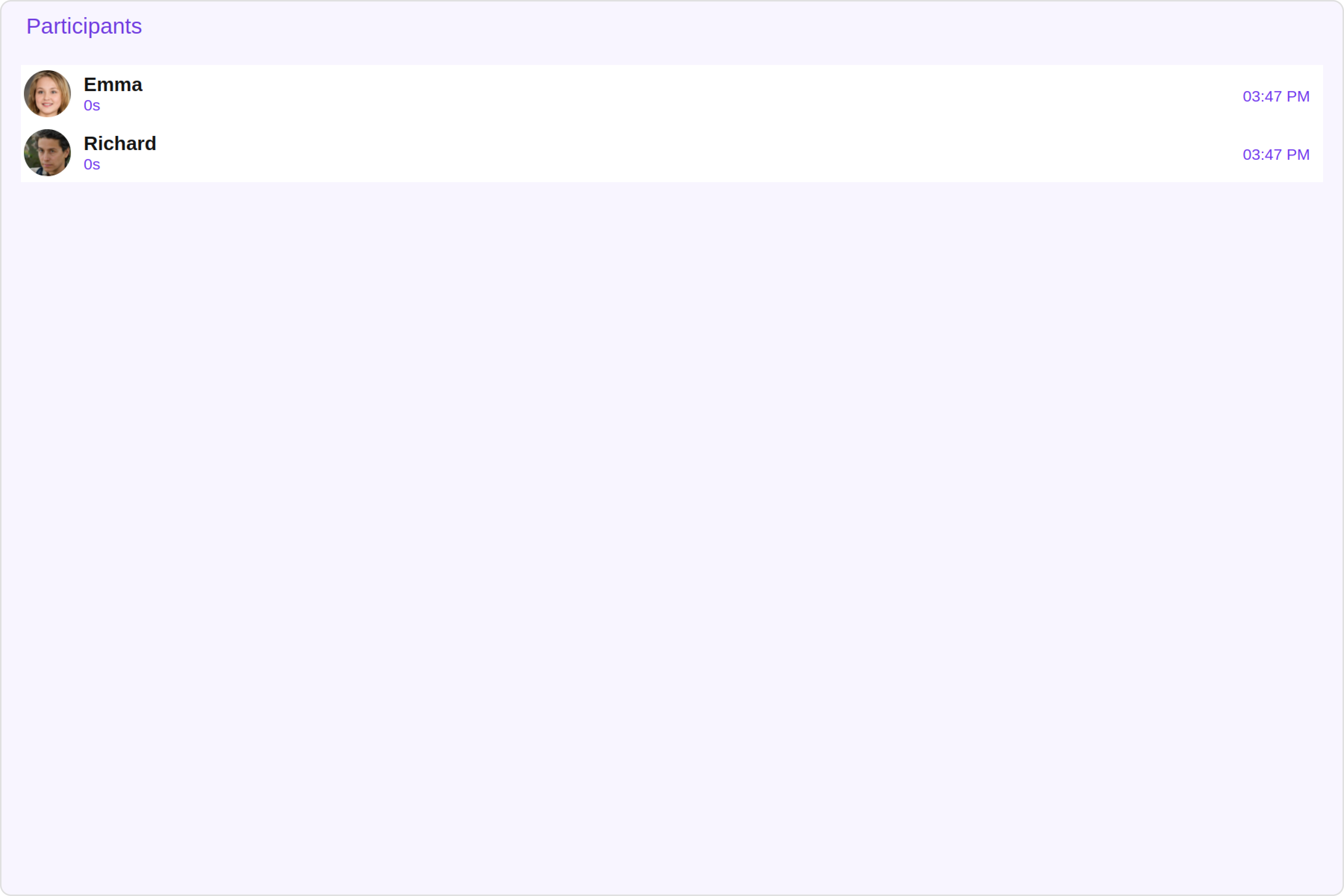 To customize the appearance, you can assign aCallLogParticipantsStyle object to the Call Log Participants component.
